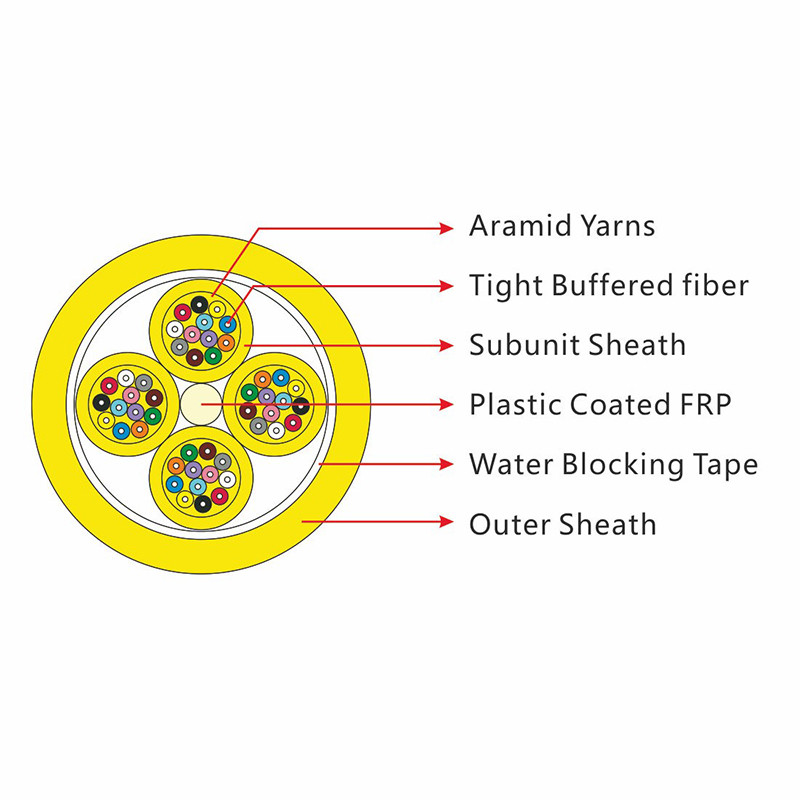 Το καλώδιο διανομής πολλαπλών σκοπών GJPFJV χρησιμοποιεί υπομονάδες 6 ινών ((900um σφιχτό απόθεμα ασφαλείας, νήμα αραμιδίου ως μέλος αντοχής).Ένα ενισχυμένο με ίνες πλαστικό (ERP) τοποθετείται στο κέντρο του πυρήνα ως μη μεταλλικό στοιχείο αντοχήςΟι υποενότητες είναι κολλημένες γύρω από τον πυρήνα του καλωδίου.