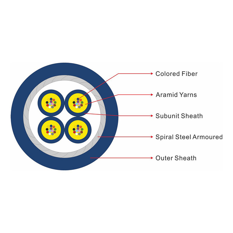 Το GJASFKV εσωτερικό πολυπυρηνικό θωρακισμένο καλώδιο οπτικών ινών είναι η πολυπυρηνική ίνα αραμίδας ενισχυμένη με μια επιφάνεια μικρής οπτικής ινής φ250μm.Ένα εσωτερικό μπουφάν από PVC ή LSZH εκκρίνεται στην επιφάνεια των ράβδων ως υπομονή, και η υπομονάδα πολυπυρηνικής δέσμης περιστρέφεται σε κύκλο Στο εξωτερικό της στρώμα που περιστρέφει ένα στρώμα ατσάλινου καλωδίου θωράκισης, η θωράκιση από ατσάλινο καλωδίου εφαρμόζεται μια μικρή ποσότητα αραμίδης,κατόπιν εξωθήθηκε εξωτερική κάλυψη από PVC ή LSZH.