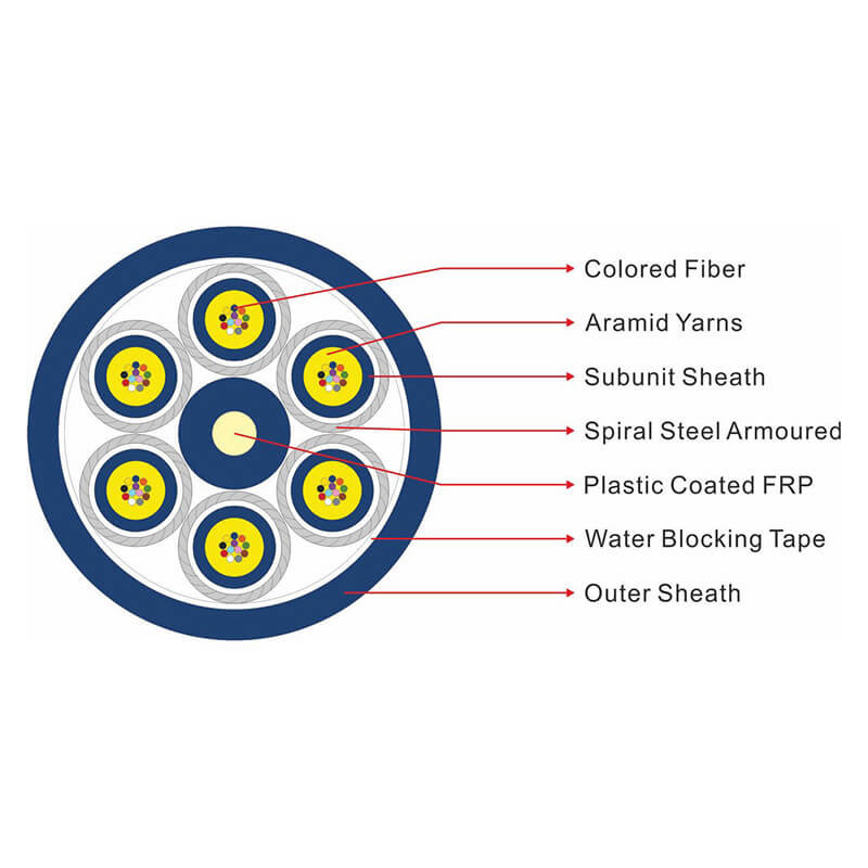 Το GJAFKV εσωτερικό καλώδιο πολυπυρηνικής δέσμης τύπου θωρακισμένου οπτικού ινών είναι μια πολυπυρηνική ίνα αραμίδης ενισχυμένη με μια επιφάνεια μικρής οπτικής ινής με πολυπυρηνική δέσμη φ250μm.Ένα στρώμα εσωτερικής κάλυψης από PVC ή LSZH εκκρίνεται στην επιφάνεια των ράβδων ως υπομονήΗ υπομονή και οι μη μεταλλικές ενισχύσεις FRP (και ενδεχομένως τα στρώματα) είναι κολλημένα σε κύκλο,περιτυλιγμένο με στεγνή ταινία αποθήκευσης νερού μεταξύ του πυρήνα και της κάλυψης, και τελικά το PVC (ή LSZH) περιβλήμα είναι καλώδιο εξάντλησης.