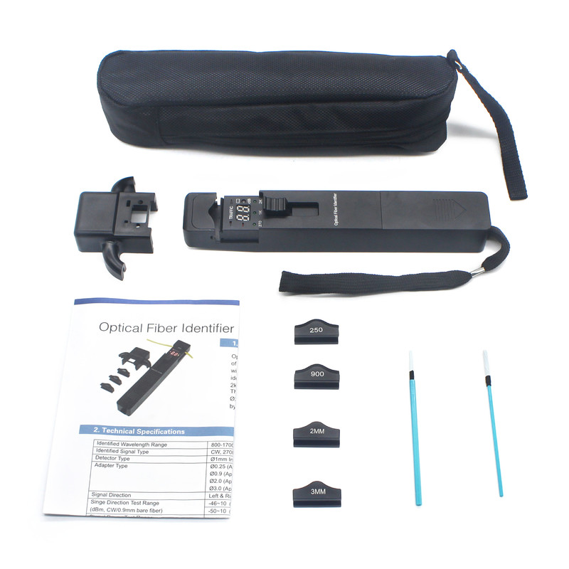 Ο Αναγνώστης Οπτικών Ινών μας μπορεί να προσδιορίσει γρήγορα την κατεύθυνση της μεταδιδόμενης ίνας και να εμφανίσει τη σχετική ισχύ του πυρήνα χωρίς καμία ζημιά στην ίνα κάμψης. Όταν υπάρχει κίνηση, ενεργοποιείται ο διακοπτόμενος ακουστικός τόνος. Αυτός ο αναγνώστης οπτικών ινών αναγνωρίζει επίσης τη διαμόρφωση όπως 270Hz, 1kHz και 2kHz. Όταν χρησιμοποιούνται για την ανίχνευση της συχνότητας, ενεργοποιείται ο συνεχής ακουστικός τόνος. Υπάρχουν τέσσερις διαθέσιμες κεφαλές προσαρμογέα: Ø0.25, Ø0.9, Ø2.0 και Ø3.0. Αυτός ο αναγνώστης οπτικών ινών τροφοδοτείται από μπαταρία αλκαλικού 9V.