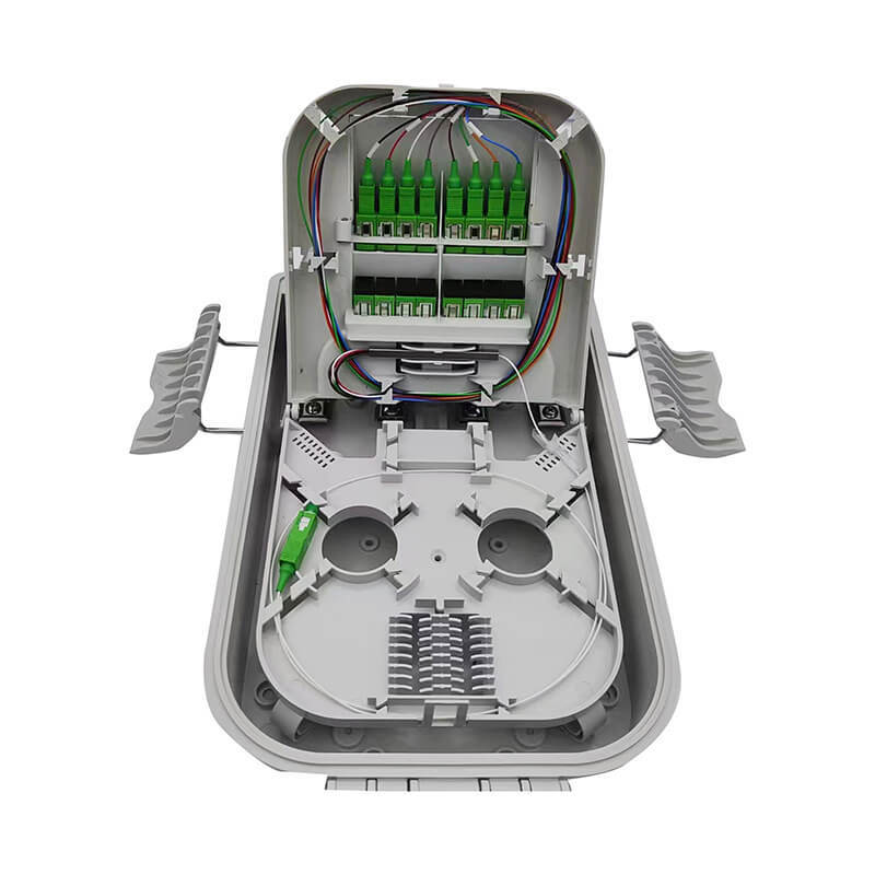 ABS FTTH λευκό/μαύρο 16 πυρήνες οπτική ίνα κουτί διανομής για εσωτερικό / εξωτερικό.Ο εξοπλισμός χρησιμοποιείται ως τερματικό σημείο για το καλώδιο τροφοδοσίας για τη σύνδεση με το καλώδιο πτώσης στο σύστημα δικτύου επικοινωνιών FTTx.Η σύνδεση ινών, η διαίρεση, η διανομή μπορούν να γίνουν σε αυτό το κουτί, και εν τω μεταξύ παρέχει σταθερή προστασία και διαχείριση για το κτίριο του δικτύου FTTx.